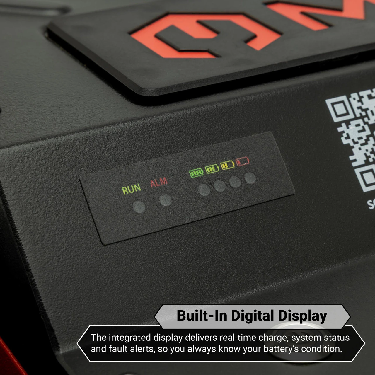 Real-time system visibility is provided through a built-in digital display panel and an LED state-of-charge meter with wake-up button, giving instant access to charge level, current, battery temperature, and fault codes. An audible warning alert system adds another layer of protection by notifying users of low power or system issues before downtime occurs.
